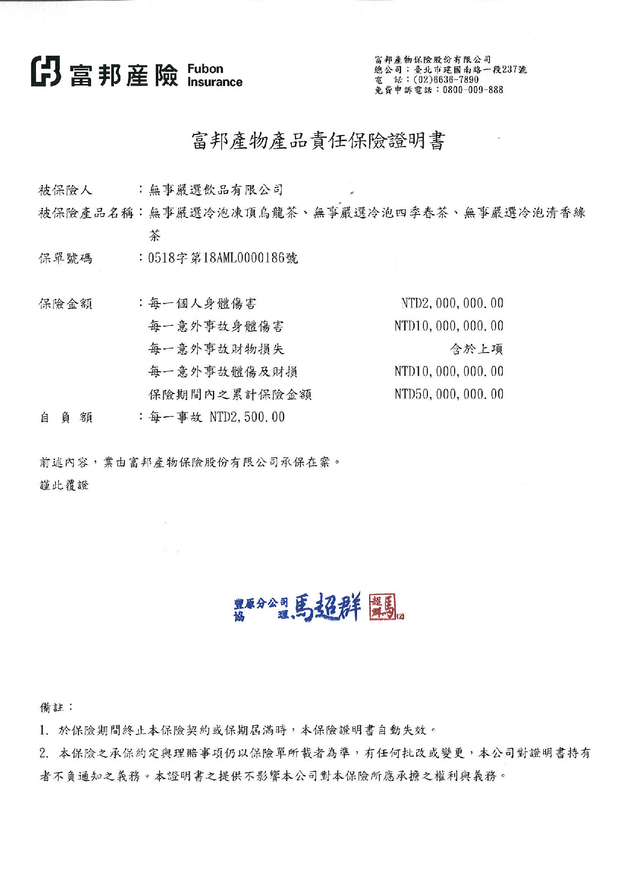 通過ISO 22000食品安全管理系統、以及HACCP 危害分析重要管制點認證ISO22000 國際食品衛生安全認證廠房,全自動生產設備流程,從貼標、洗瓶、填充等流程等,最後經由人工瓶瓶把關,除了要讓消費者喝了安心,更是讓銷售店家做最大的保障與後盾,除了生產源頭把關,更投保產品5000萬元險,讓銷售店家與消費者皆有最大的食安保障。