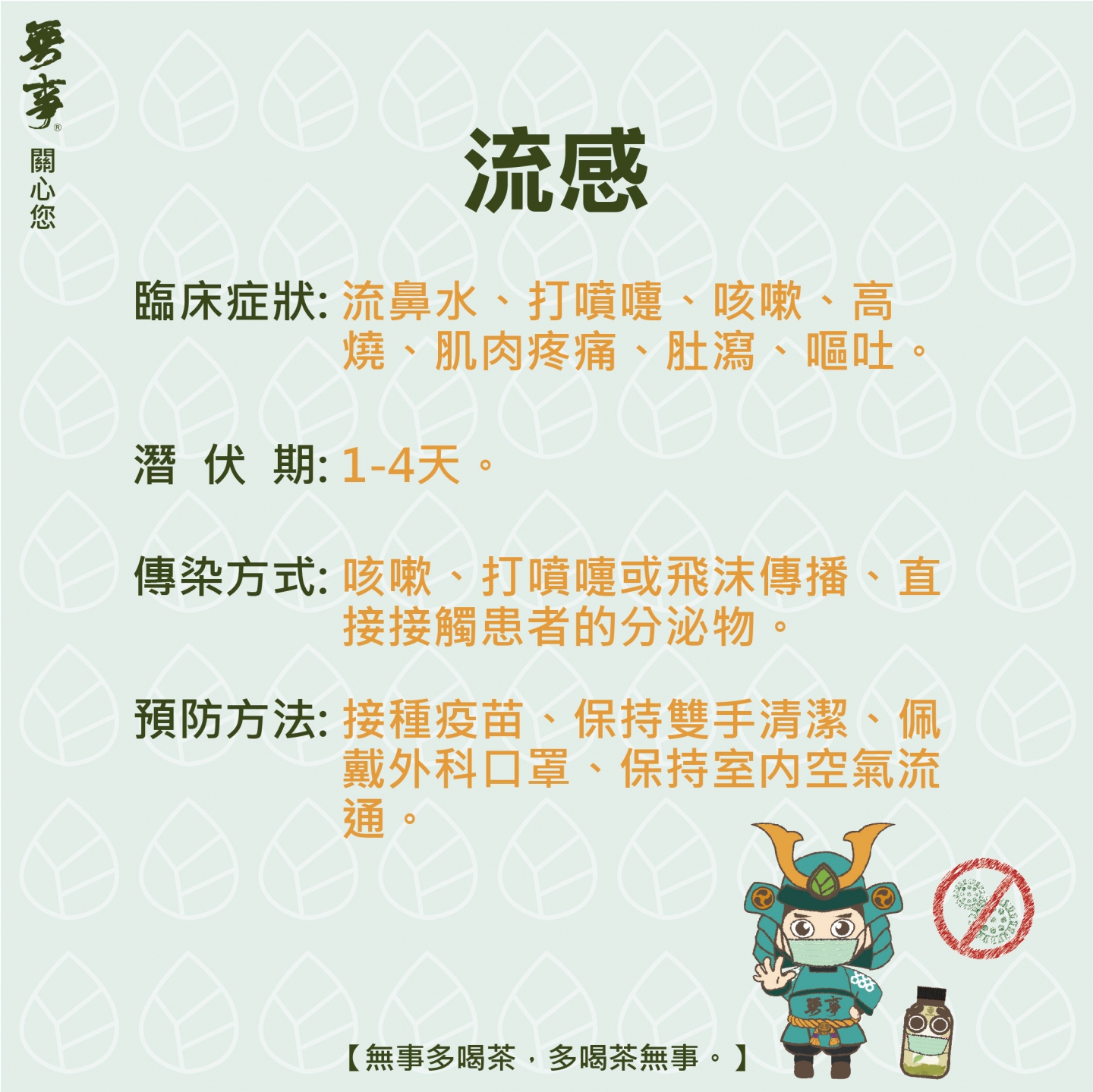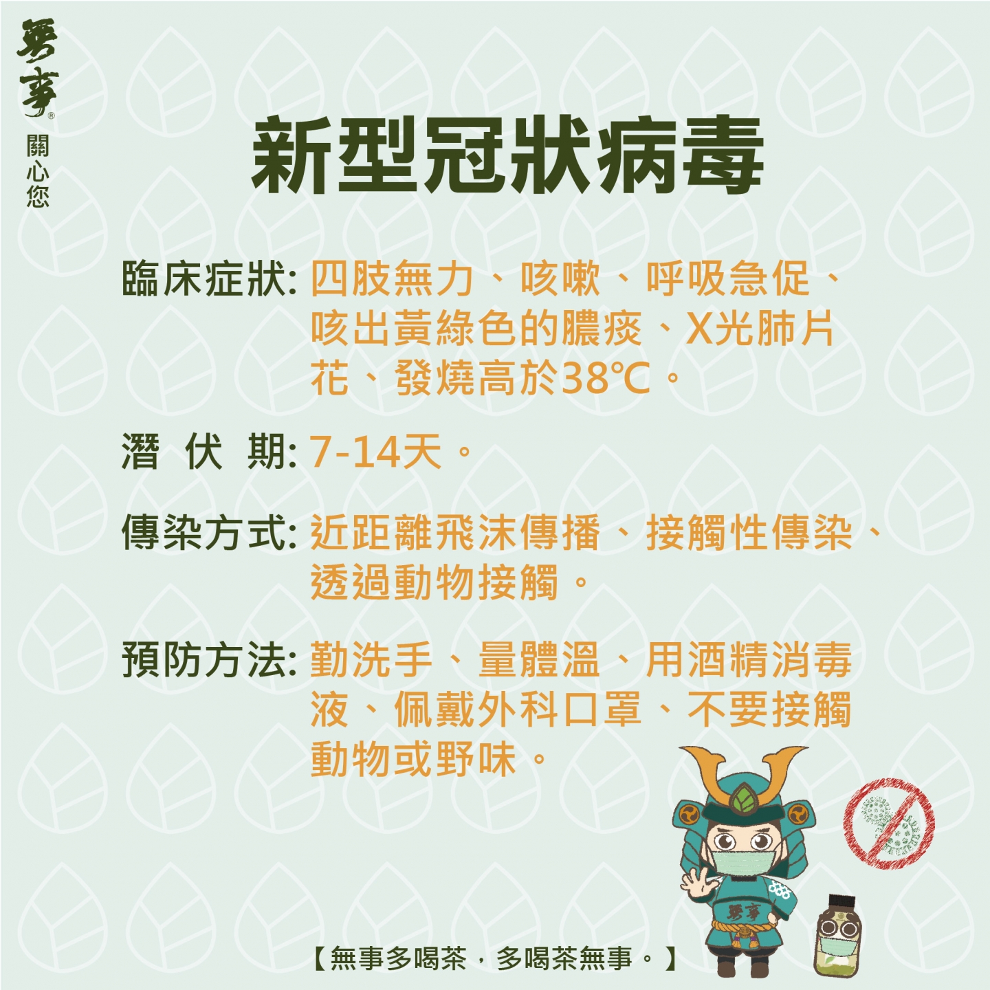中國武漢肺炎疫情日趨嚴重,無事嚴選飲品有限公司配合政府防疫措施,自主發起全面防護作為,自即日(26日)起,物流司機內部人員一律主動配戴口罩上班,同時,上班前須量體溫,自主監測,如果有發燒情況,即刻停止上班、回家休息。
